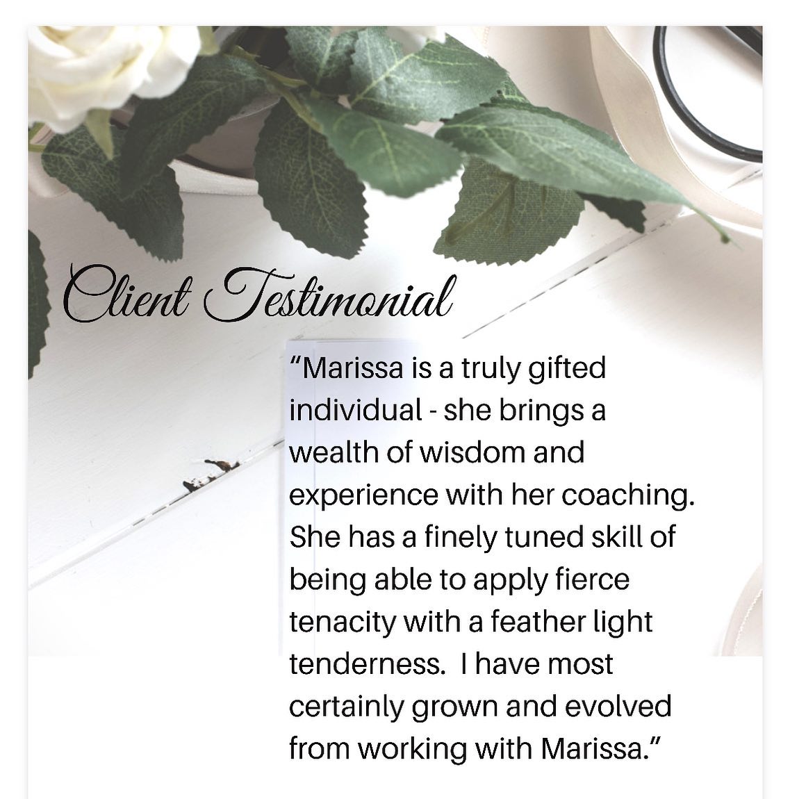 “Marissa is a truly gifted individual - she brings a wealth of wisdom and experience with her coaching. She has a finely tuned skill of being able to apply fierce tenacity with a feather light tenderness. I have most certainly grown and evolved from working with Marissa.” – Melissa